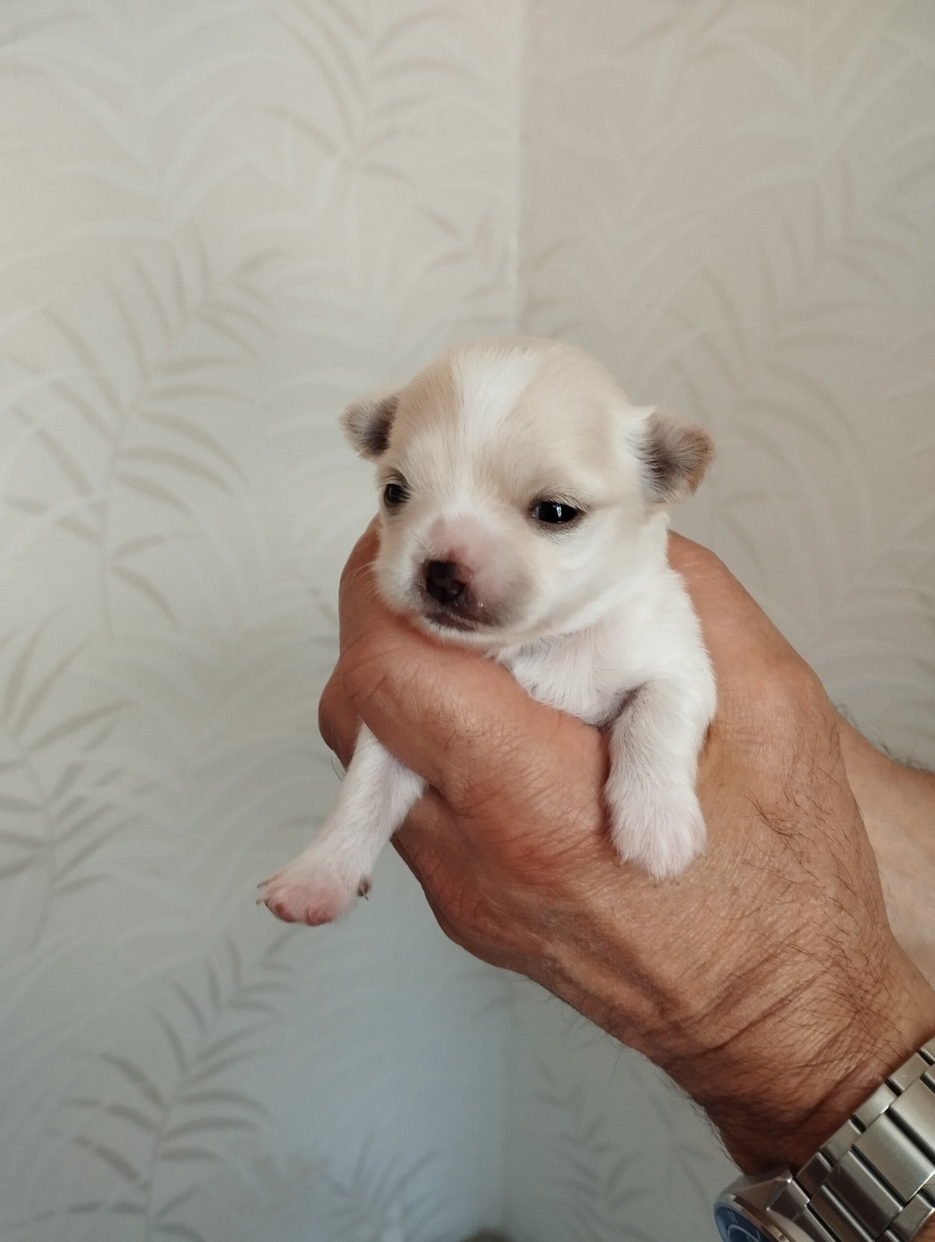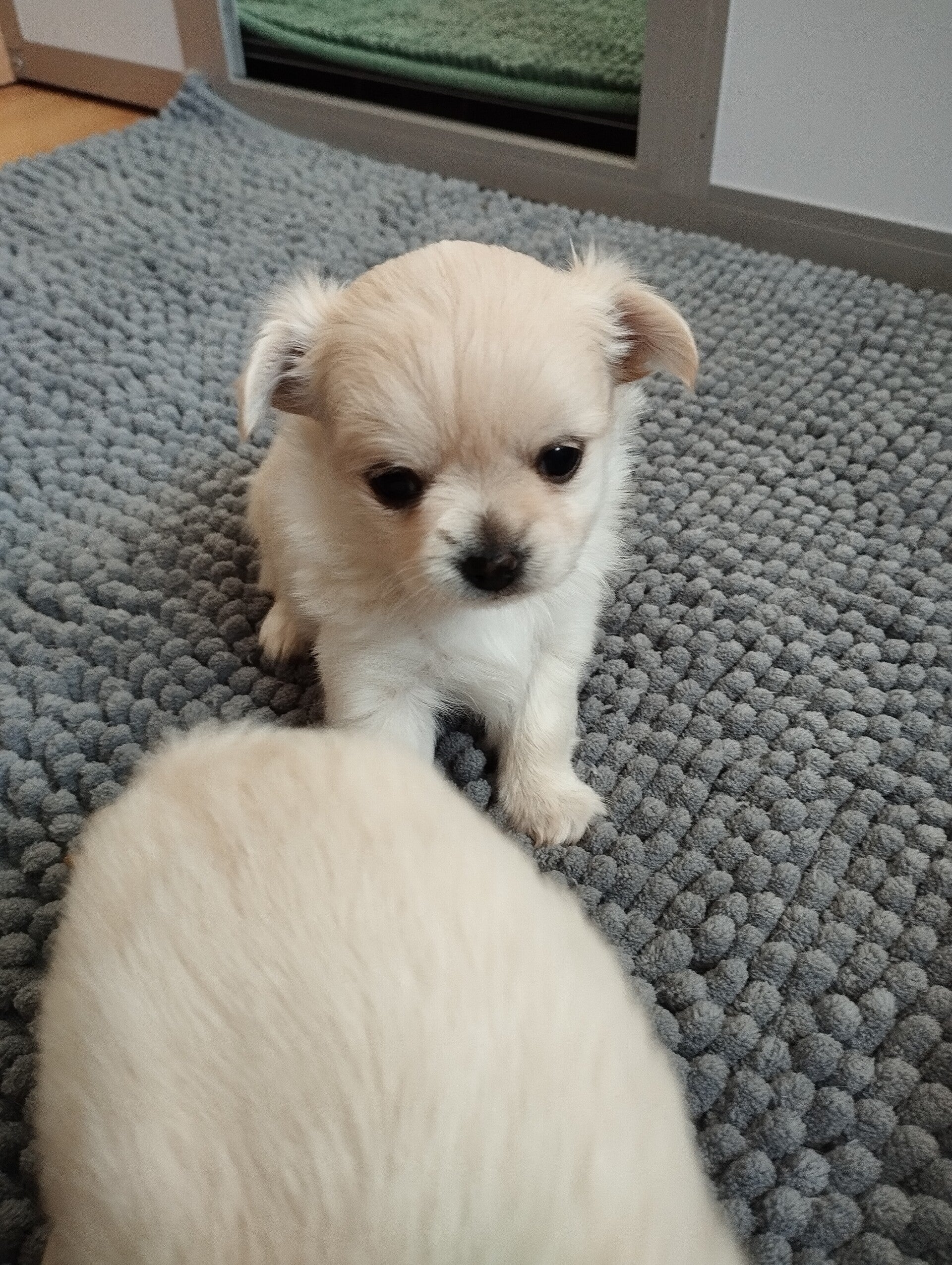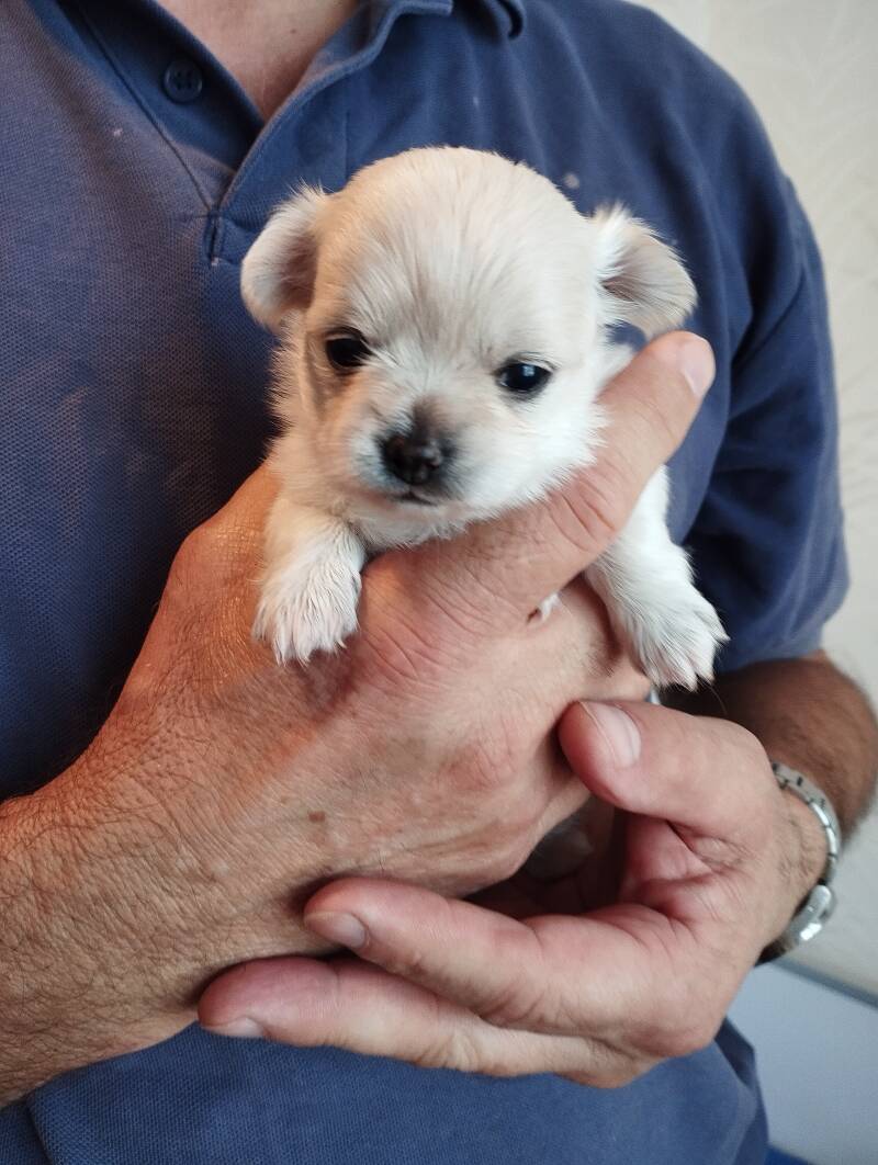 3 semaines pour ce tout petit chihuahua LOF à poils longs que nous avons prénommé Appy (le nom est provisoire). Il commence à tenir sur ses pattes, mais l'équilibre est encore un peu difficile.