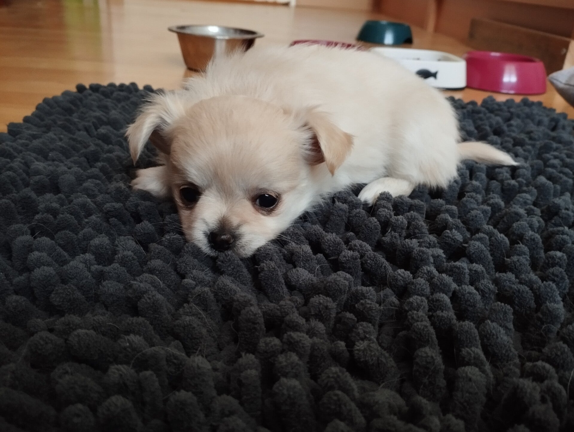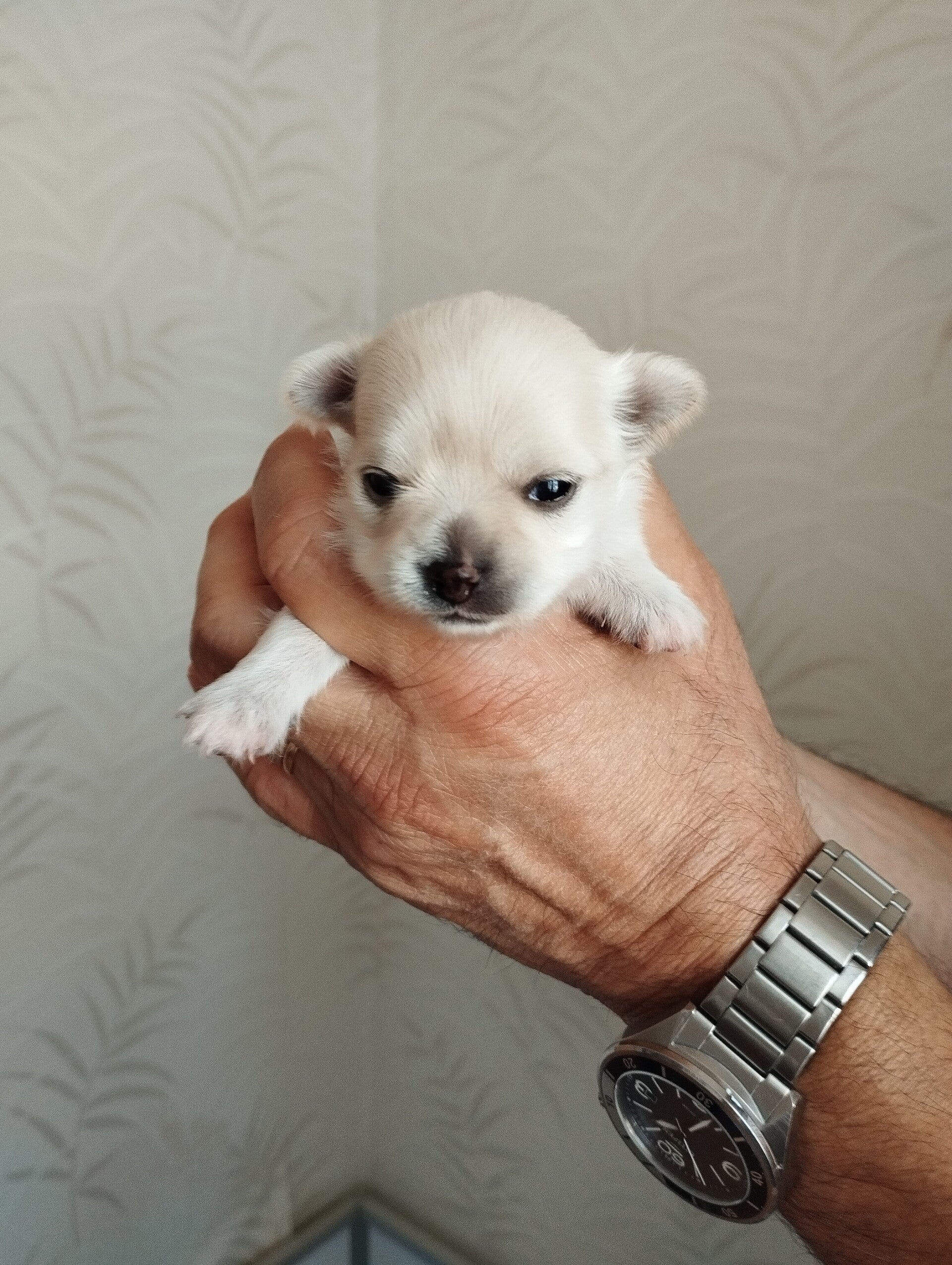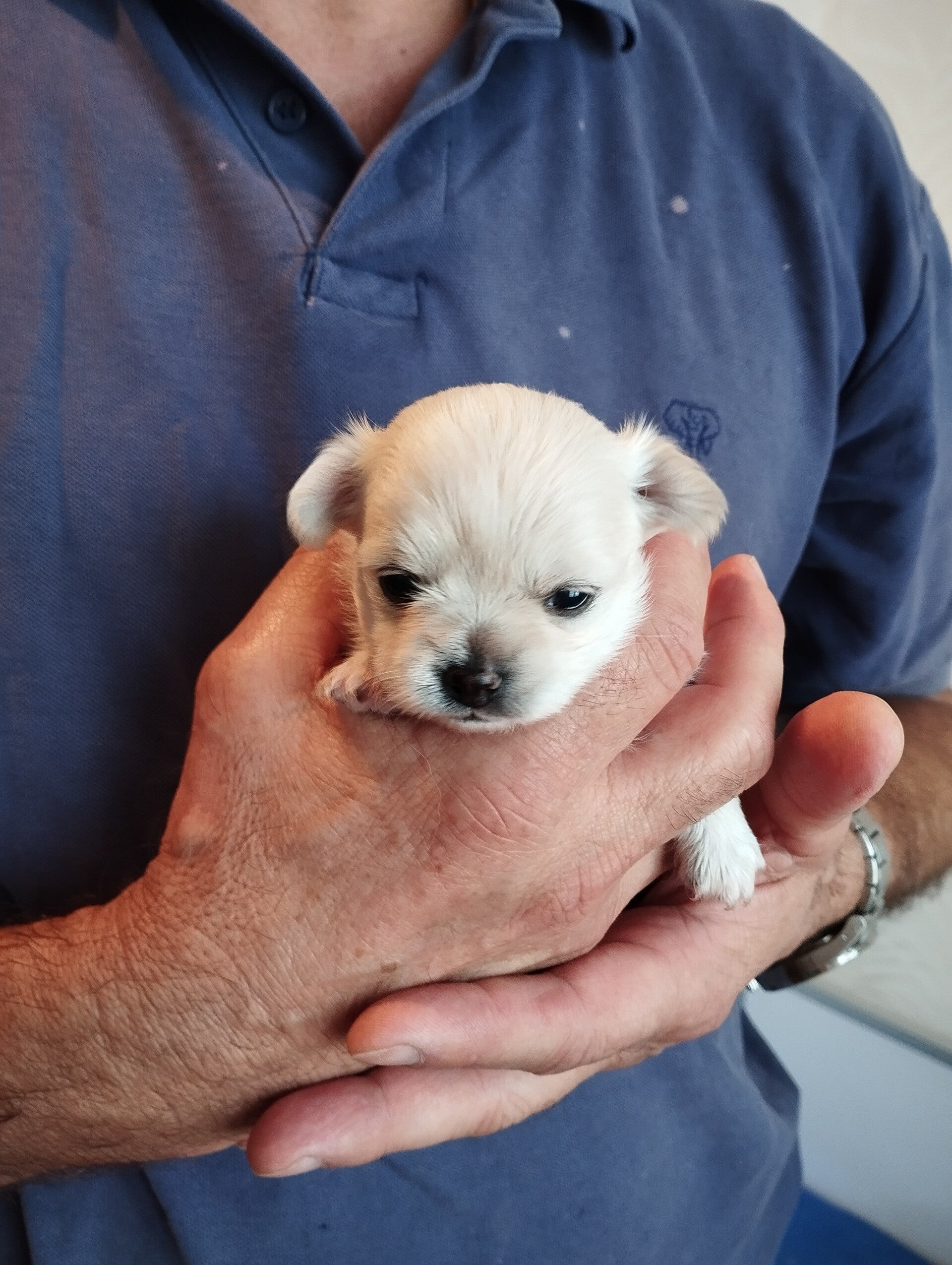 3 semaines pour ce tout petit chihuahua LOF à poils longs que nous avons prénommé Appy (le nom est provisoire). Il commence à tenir sur ses pattes, mais l'équilibre est encore un peu difficile.